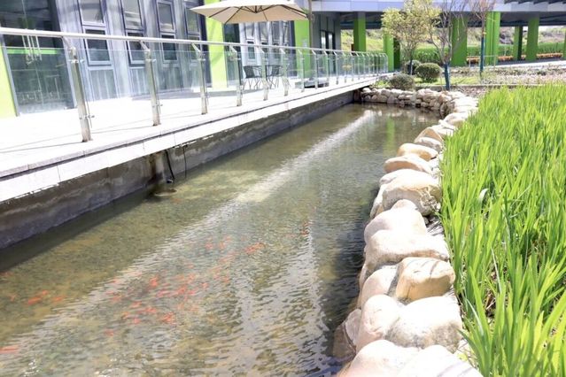 ——教學(xué)樓周邊利用雨水回收系統(tǒng),建有下凹式綠地和景觀魚池,既實(shí)現(xiàn)了循環(huán)利用雨水的環(huán)保功能,更是孩子們課間休息玩耍、做科學(xué)實(shí)踐活動(dòng)的好去處。