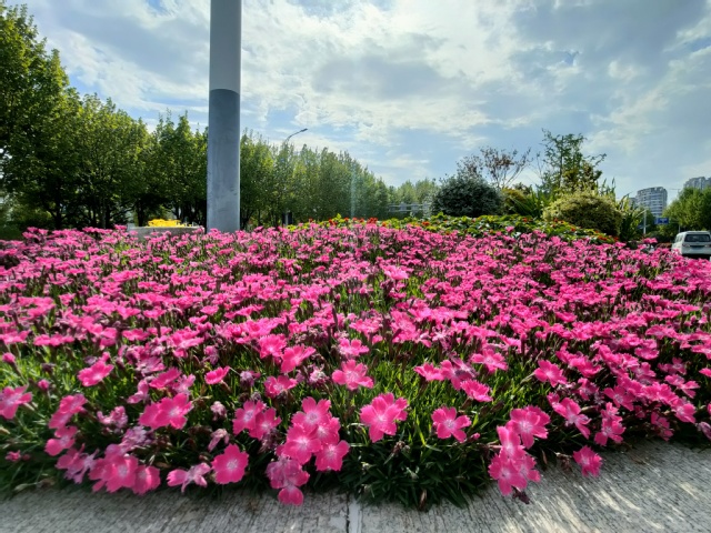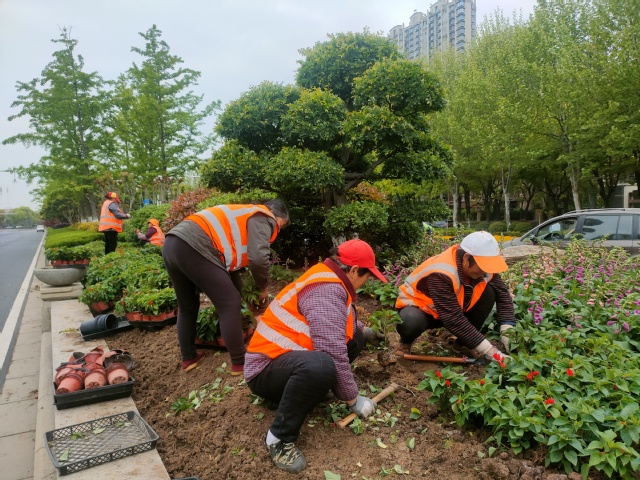 在草花品種上,除了選用一串紅、孔雀草、矮牽牛、繁星花等常規(guī)季節(jié)性、花期較長(zhǎng)的品種外,還新增了毛地黃、垂吊牽牛、金葉雪茄花、超級(jí)海棠、歐石竹、常夏石竹、藿香薊等市民喜歡且生命力旺盛的草花品種。多顏色、多品種的搭配,達(dá)到了花色靚麗多彩、層次錯(cuò)落有致、春意盎然的景觀效果,提升了河西中部地區(qū)道路景觀品質(zhì),扮靚了河西新城。