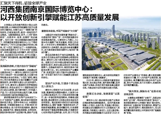 2025年全國“兩會(huì)”期間,揚(yáng)子晚報(bào)全媒體平臺(tái)推出《春天的號(hào)角》專題報(bào)道,總結(jié)江蘇各地各部門在推進(jìn)高質(zhì)量發(fā)展中取得的新進(jìn)展、新成果,展望新的一年奮進(jìn)路上的新希望、新作為。3月6日,《揚(yáng)子晚報(bào)》刊登河西集團(tuán)南京國際博覽中心深度專題報(bào)道,展現(xiàn)博覽中心在“十四五”期間高質(zhì)量完成規(guī)劃目標(biāo)任務(wù),努力在行業(yè)領(lǐng)域營造更加充分的先行優(yōu)勢,在江蘇高質(zhì)量發(fā)展的藍(lán)圖上書寫新時(shí)代的“強(qiáng)富美高”答卷。